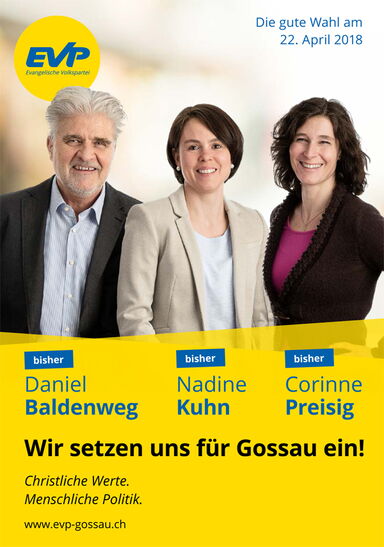Die EVP Gossau nahm mit 3 bisherigen Behördenmitgliedern an den Gemeindewahlen vom 22. April 2018 teil. Alle drei Behördenmitglieder wurden wieder gewählt. Vielen Dank für Ihre Unterstützung!